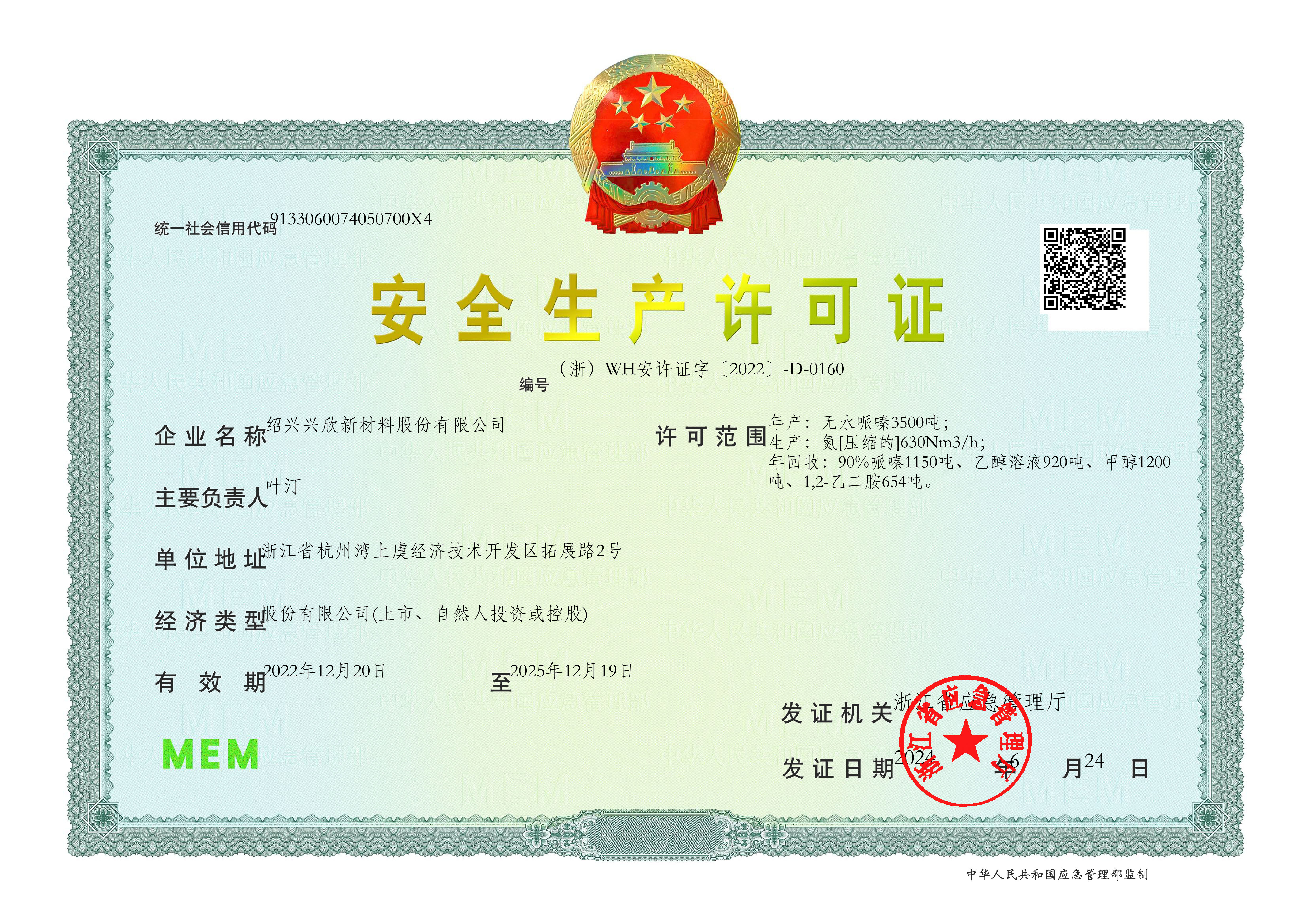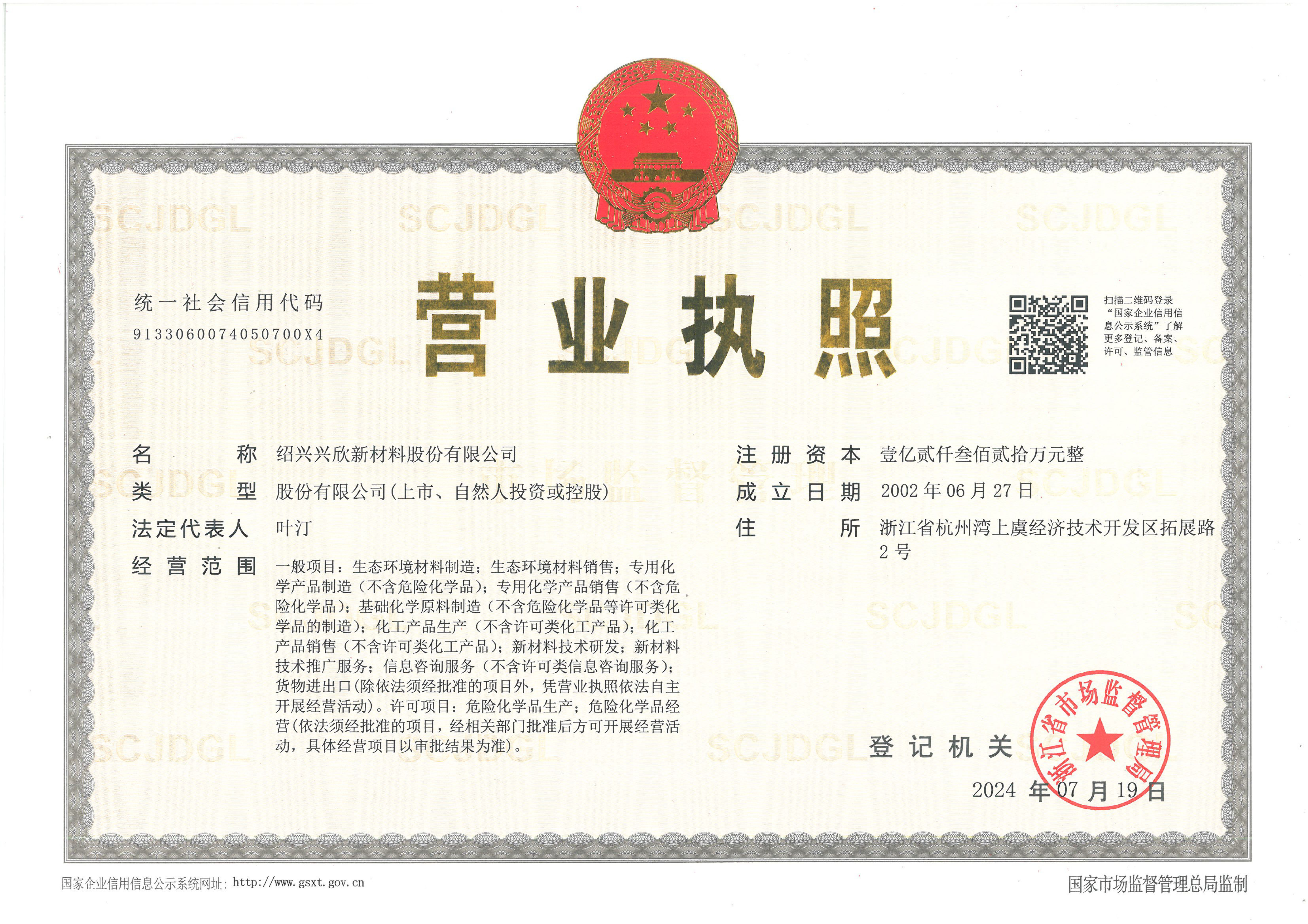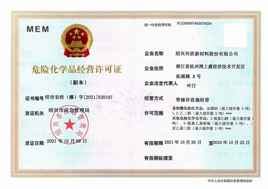 紹興興欣新材料股份有限公司成立于2002年06月27日,占地面積122畝,位于杭州灣上虞經(jīng)濟(jì)技術(shù)開發(fā)區(qū)拓展路2號,現(xiàn)有職工200余人,專業(yè)技術(shù)人員50余人;博士、碩士研究生30余人組成的一支知識型、專業(yè)化的技術(shù)科研團(tuán)隊。公司面向全球市場,專業(yè)開發(fā)電子化學(xué)品、環(huán)?;瘜W(xué)品、醫(yī)藥中間體、高分子材料等先進(jìn)新材料重點領(lǐng)域的省級科技型企業(yè);建有浙江上虞、安徽東至兩個生產(chǎn)基地。目前為“國家高新技術(shù)企業(yè)”、浙江省“隱形冠軍”企業(yè)、浙江省專精特新中小企業(yè);建有“省級”研究開發(fā)中心,共建天津大學(xué)浙江紹興研究院電子化學(xué)品研發(fā)中心。